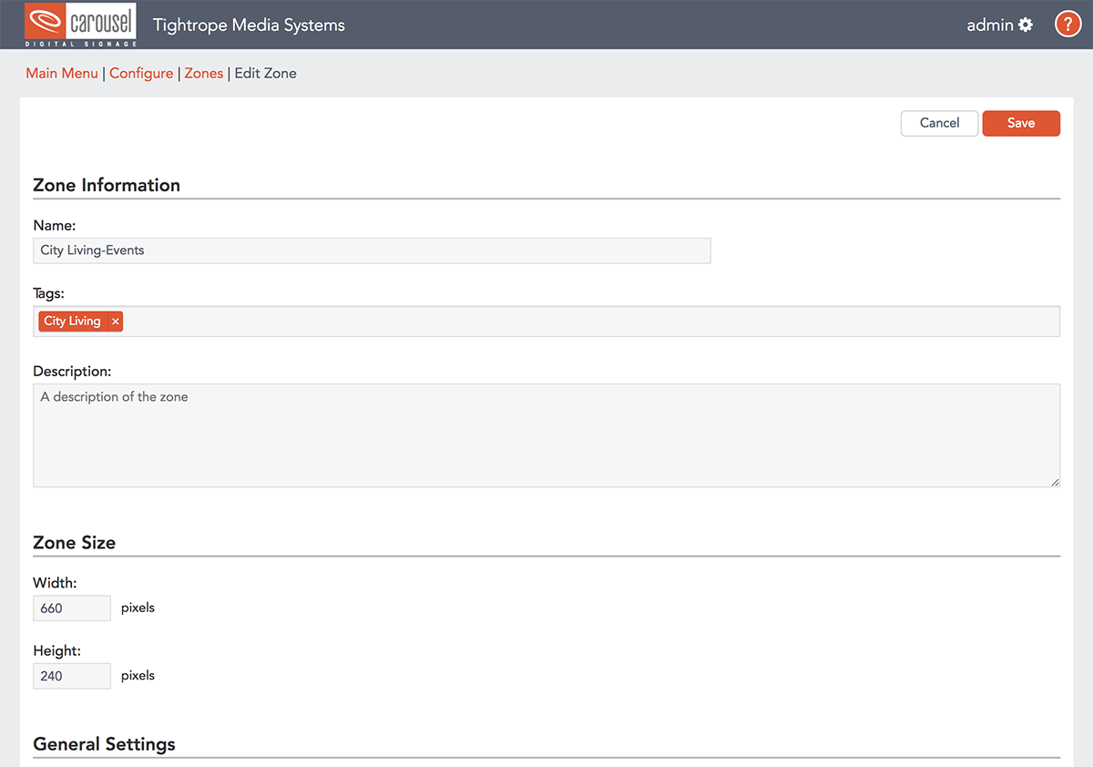 Zones can be any pixel dimensions. This means you can build layouts at any resolution that you would like. From low resolution displays to 4k and higher, Carousel's graphics processing can accommodate whatever you need.