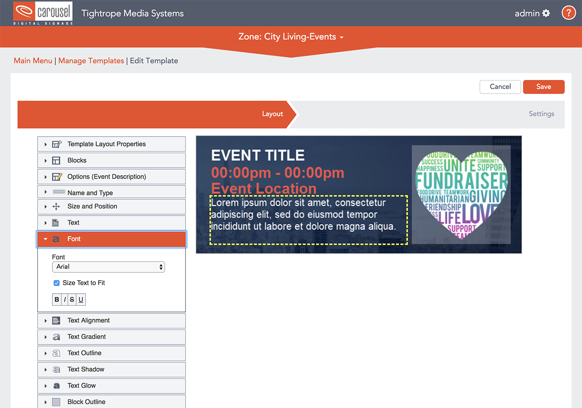Text in templates can be set to automatically size the text. This allows users to type in a variety of information and have it always fit the text area it is designed for. This feature will make your content always look great.