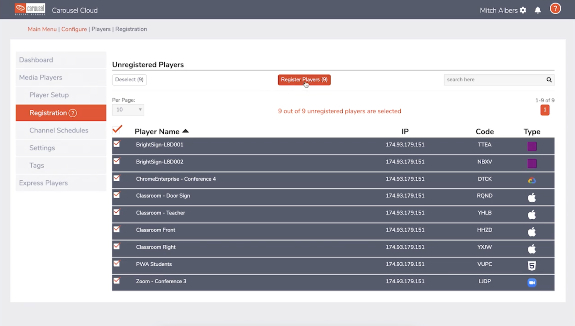 You can use the Batch Registration feature to register players individually or in large batches, right from the comfort of your workspace! This method is recommended if you are deploying 10 or more media players at once, need to set the channel for different groups of media players, and if you can not easily see the screen of each one of your players.
