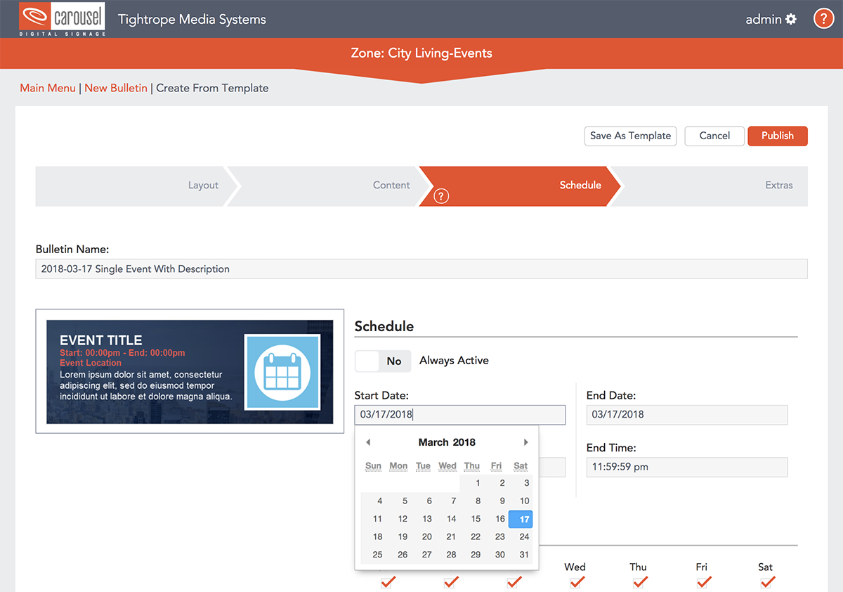 Scheduling content is a snap. Just use the calendar to set when you want your content to go on and off. Each piece of content in Carousel get's is own schedule so it's easy to keep your playlist fresh!