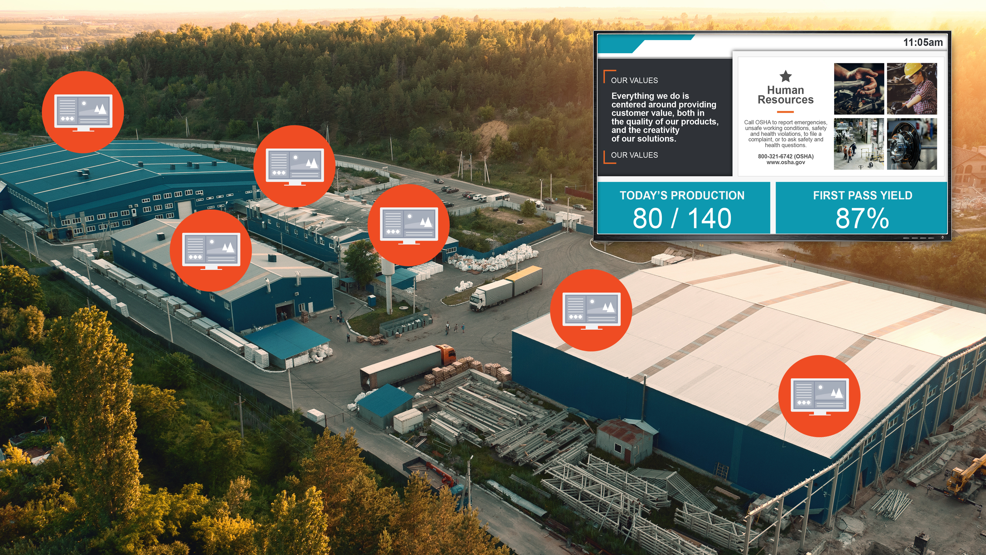 Many of these buildings are distant enough to require transportation. It is therefore easy to envision that communications across the entire campus can be a challenge. Workers on the manufacturing floor receive important information much later than others, and in today’s world communication by email doesn’t guarantee that messages will be received and read in a timely manner. Company executives soon found a potential answer in digital signage, with the goal of communicating more efficiently with staff and visitors that frequent the manufacturing floors, lobbies and cafeterias across each location.