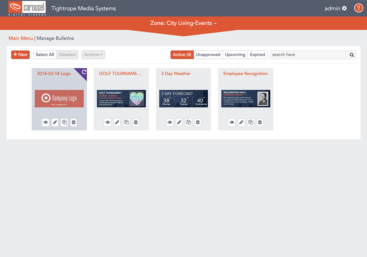 Not all content is created equal! Sometimes you have a big playlist and you want some messages to be played more often than others. Instead of making a bunch of copies, Carousel uses repeating bulletins. This allows you to set how often the bulletin is displayed. For example, you might want your company logo displayed every other bulletin.