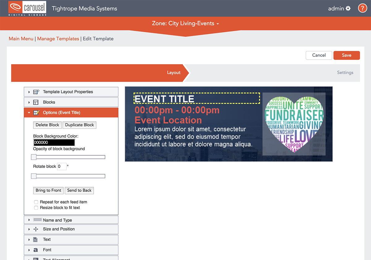 Text blocks in templates define where the user can type in their information. These blocks have a ton of properties like outlines, fills and shadows. They can also limit the amount of characters entered so users don't put in too much information. Even more, the text areas can be set to automatically scale the text to fit the region so everything looks polished.