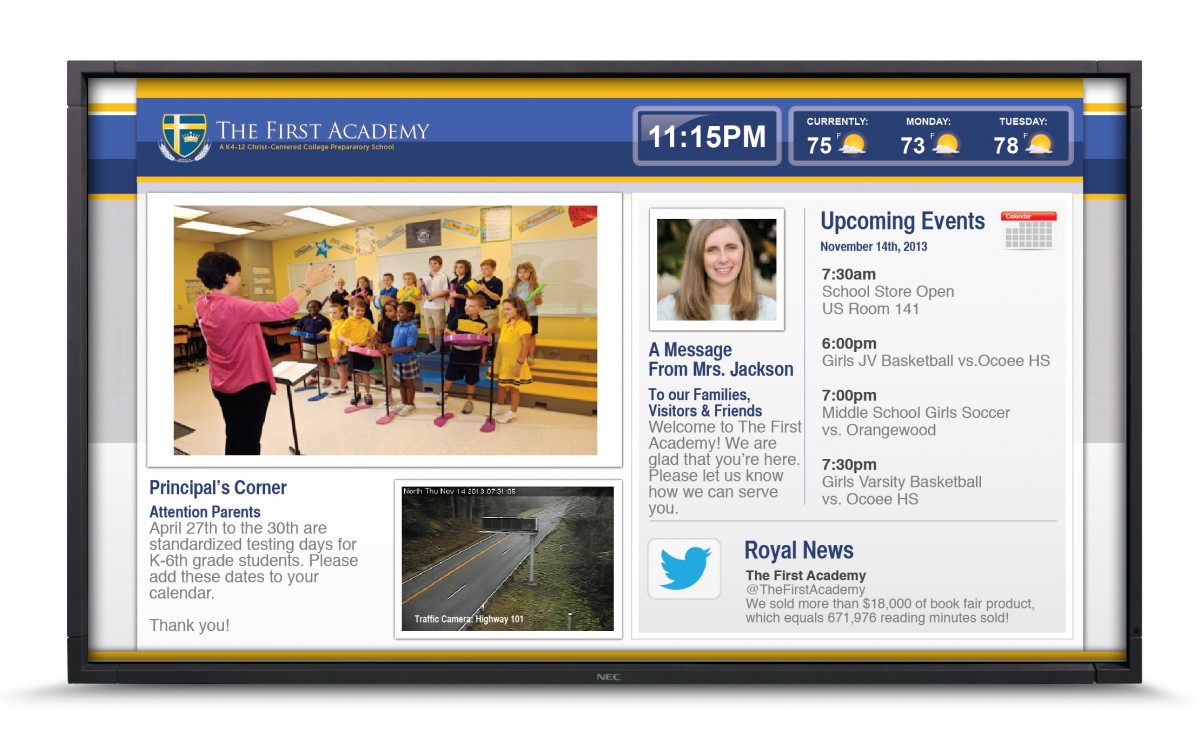 The First Academy is committed to using state-of-the-art technology, including iPads, computers and digital media systems like Carousel to support and enhance the academic experience. In the case of Carousel, each school division can easily create unique content, which is automatically delivered to a zone on their display. While the Upper, Middle and Lower schools see information focused on their school experience, items that pertain to all TFA students, like school store sales or the weather, are pushed to all the displays at once.