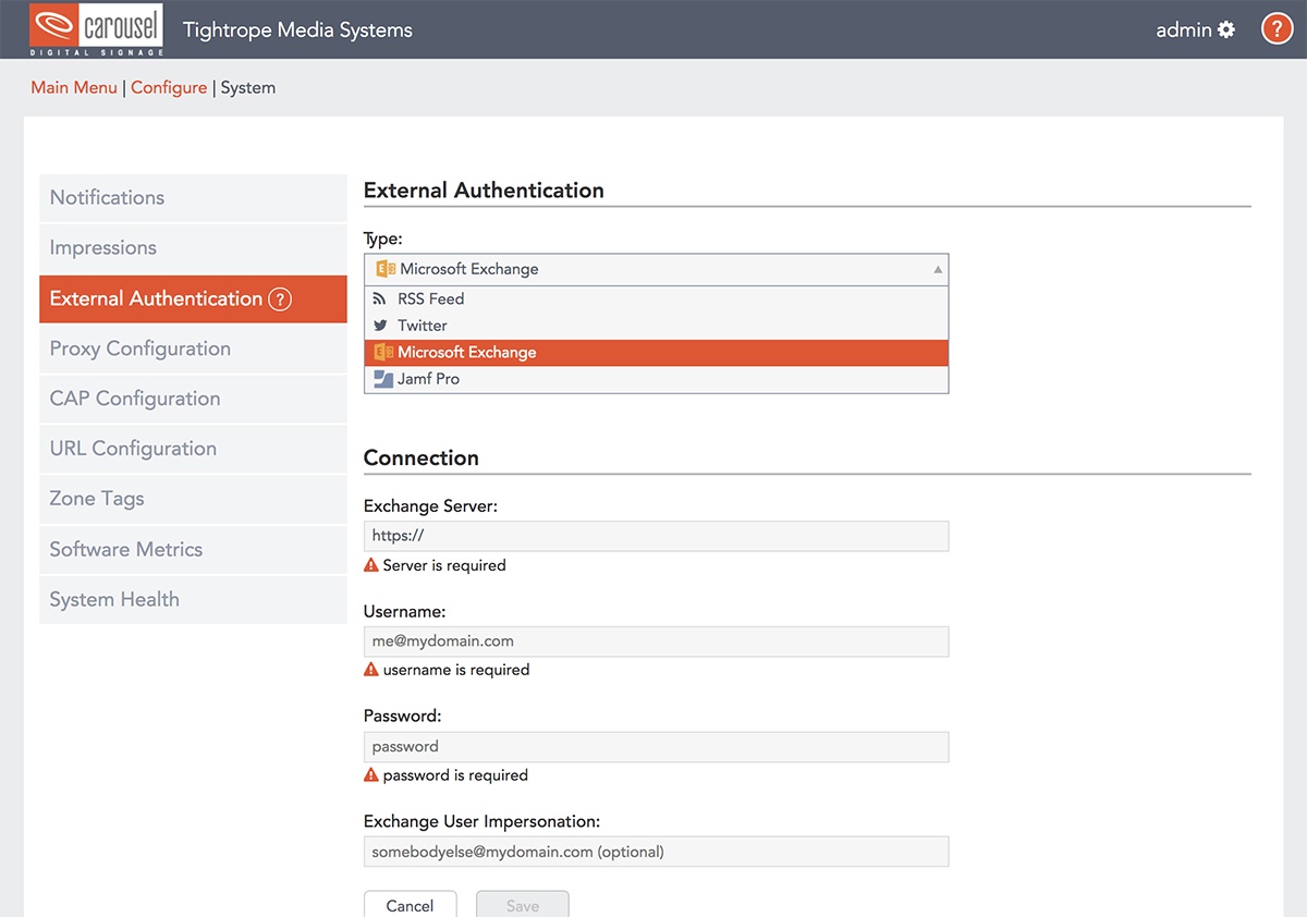 External authentications to data sources such as Exchange server accounts can be configured by the administrator. This is helpful when you want users to have access to protected data sources but not the credentials to them. By enabling authentications on a system level users can get the data they want and administrators can have the control they need.
