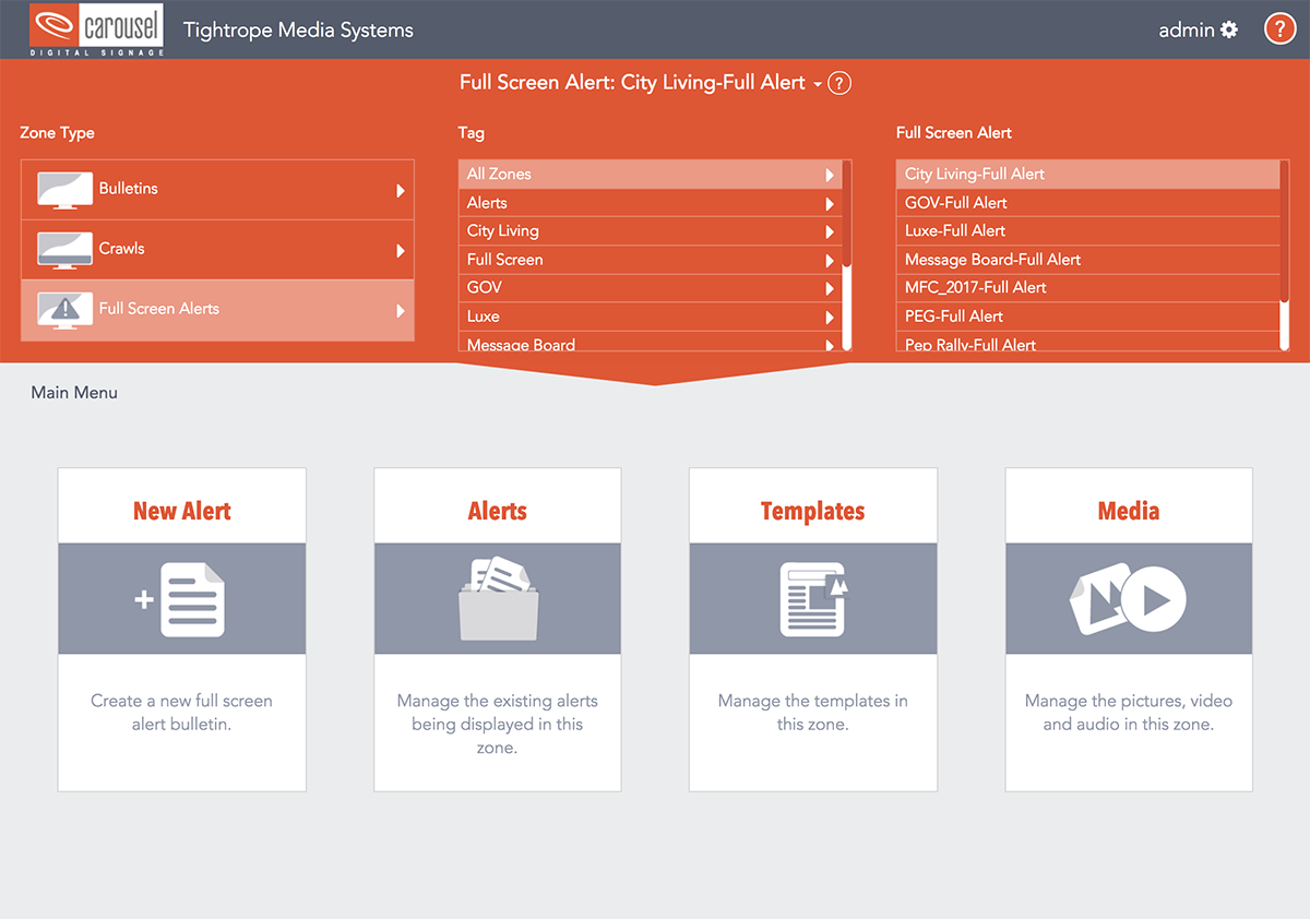 With alerts you can easily override playlists with high importance messages. Carousel provides 2 levels of alerts. Zone alerts that just override the content in a particular zone and Full Screen alerts that override an entire channel. The great thing about the way alerts work in Carousel is that you can create user accounts that can only create alert content. This allows you to give emergency personnel access to create emergency messages without giving them access to the entire signage network. Even more, the user interface for these users will only show them what they need to get the job done!