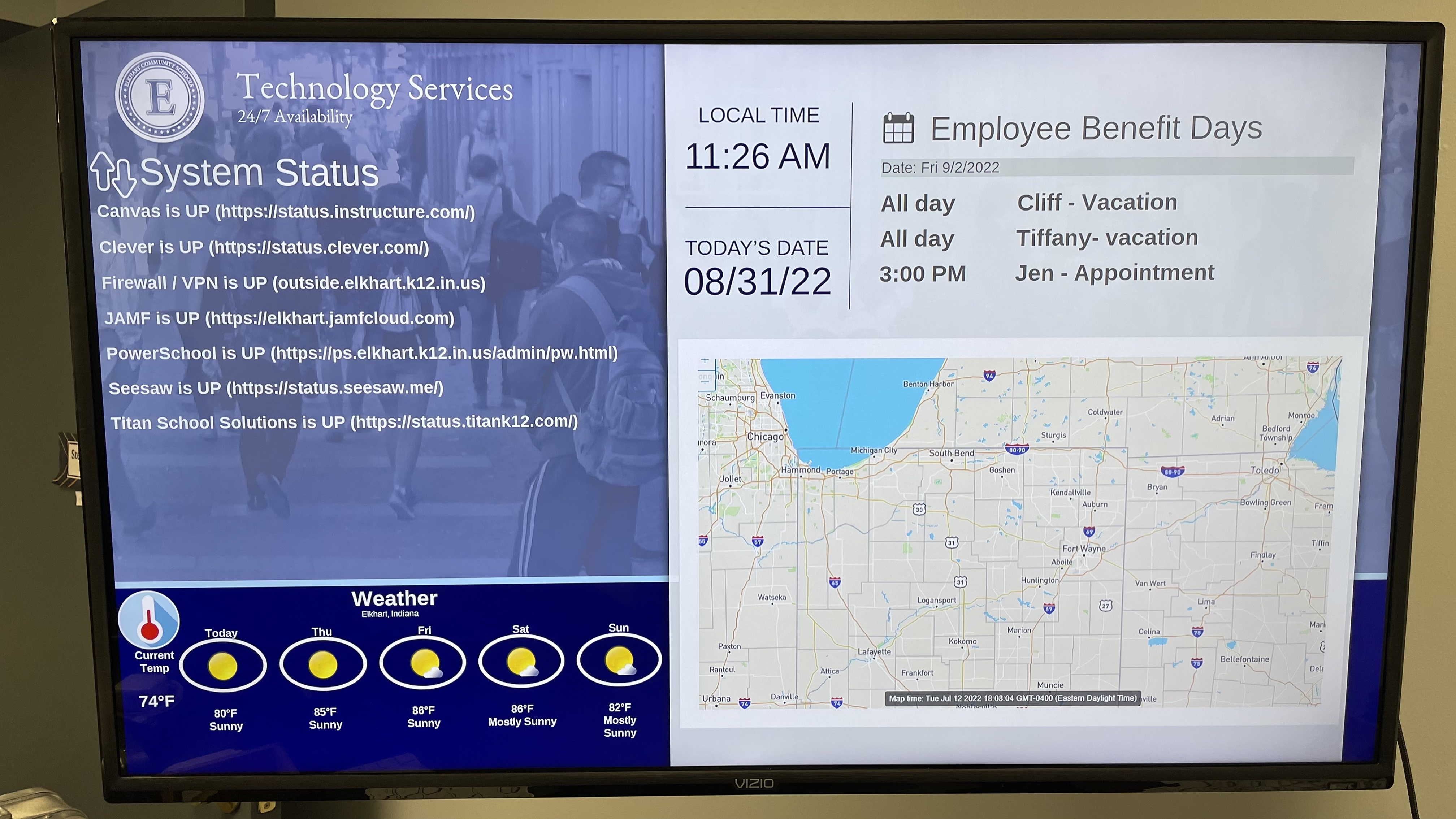 Elkhart Community Schools has now successfully rolled out the new solution at Elkhart High School, explains Stephen DeCook, Technology Deployment Administrator at the district. The system is configured into separate zones to address the needs of different departments, such as arts, athletics, business, and food services. Each department can now contribute content and messages related to classes, special events, and programs, with food services updating menu options daily.