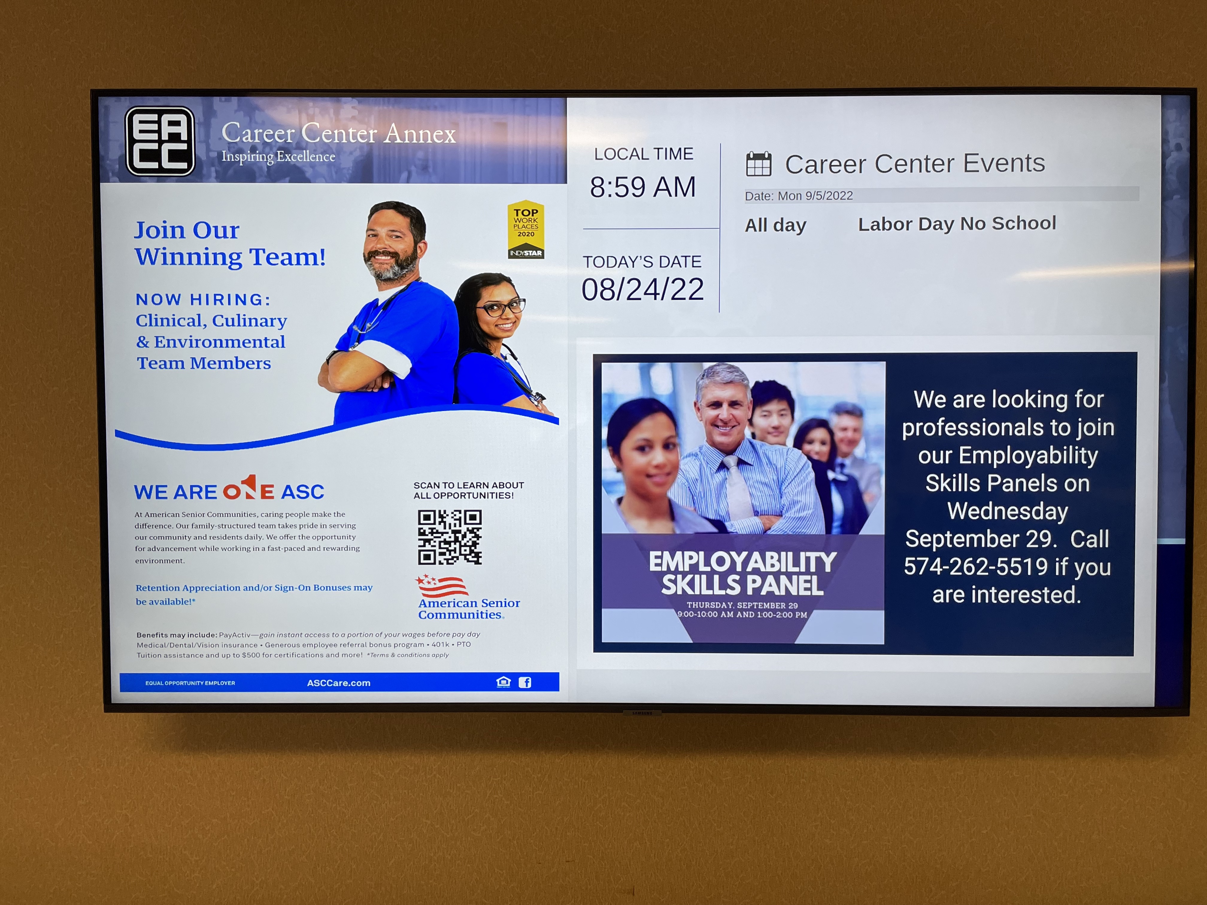 MINNEAPOLIS, MINNESOTA, September 6, 2022 – Carousel Digital Signage has provided Elkhart Community Schools with a seamless way to communicate timely, up-to-date messages to its diverse network of students, faculty, staff, and visitors. The K-12 public school district now uses Carousel Cloud to distribute department-specific messaging throughout its high school. The school district is also working with Carousel partner Jamf to securely convert Apple TV devices into media players, and providing access to meeting room schedules on mobile devices.