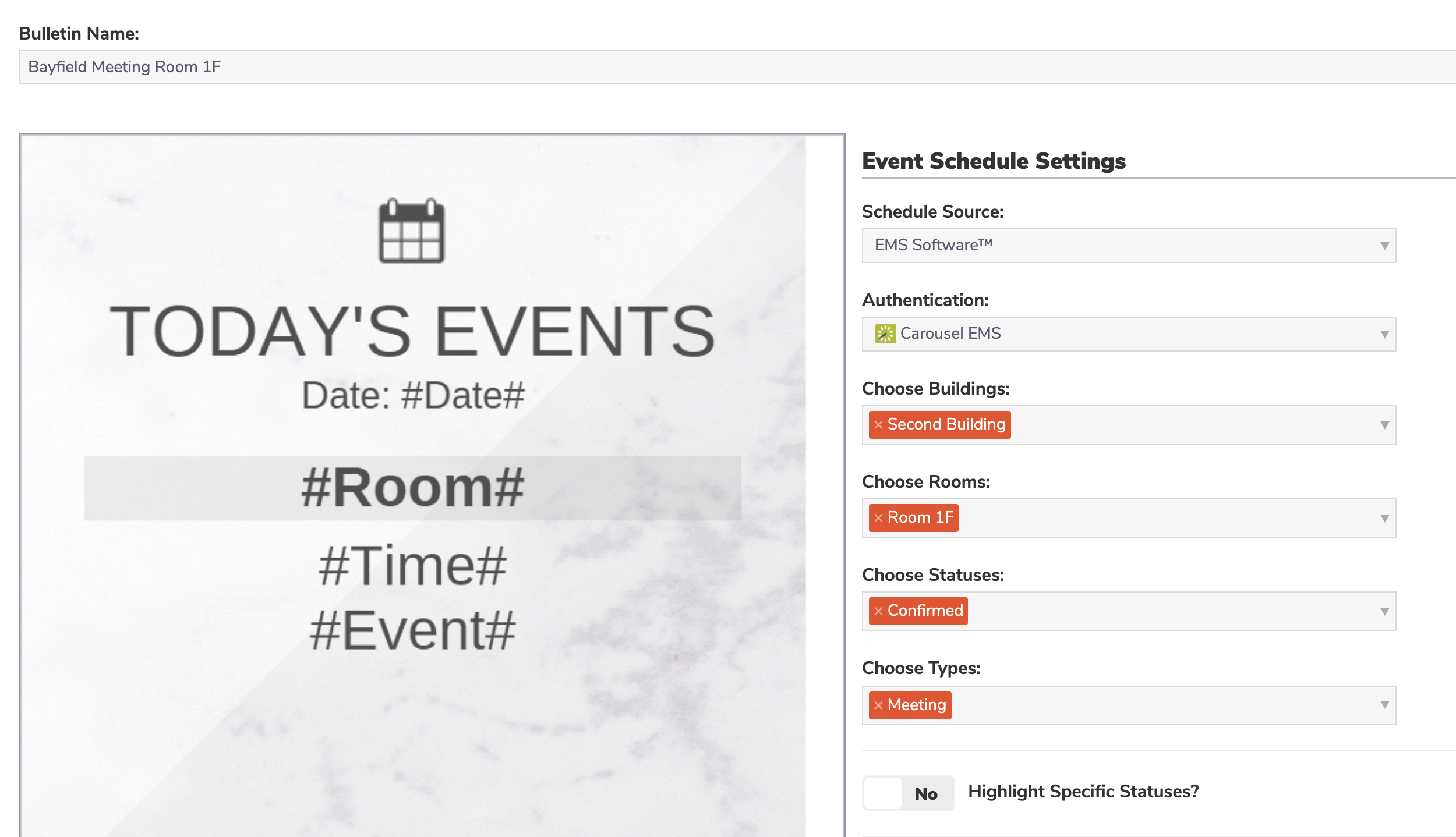 Carousel can pull data from EMS Software to display event dates, times, rooms, and names. This is great to show the schedule of events that are happening in your conference rooms or facilities.