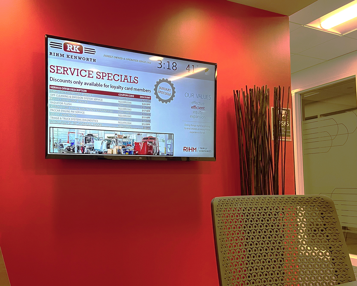 MINNEAPOLIS, February 1, 2022 – Celebrating its 90th year in business, Rihm Family Companies operates seven Kenworth truck dealerships in Minnesota and Wisconsin that represent the pulse of its customer-facing operations. Several years ago, the family-owned and operated company transitioned from print media to digital signage for customer communications from its busiest and newest locations, using on-premise software from Carousel Digital Signage.