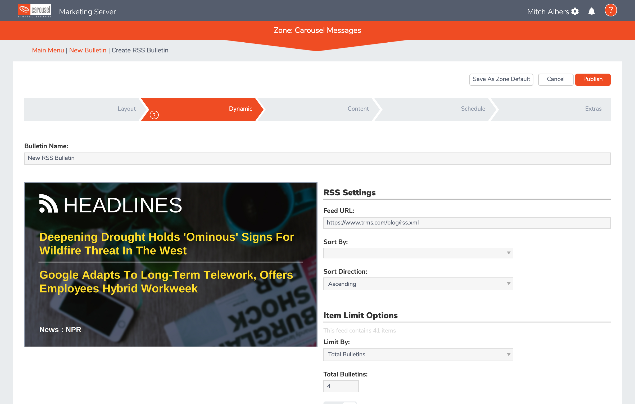 RSS feeds bring in data from other systems and news providers. Simply point Carousel at an RSS URL and away you go. You can sort and limit the feed. Carousel will format the information to look great on your digital signage.