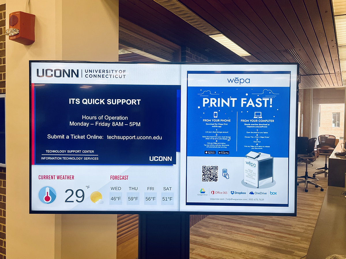 Brien Woodaman, AV Technician and Digital Signage Service Manager at UConn, explains that the university began standardizing its digital signage systems in 2016. At the time, each department used its own homegrown solution, leading to inconsistencies in service offerings, scalability, hosting, and performance. “There was a lot of confusion, so there was a push to standardize,” he said.