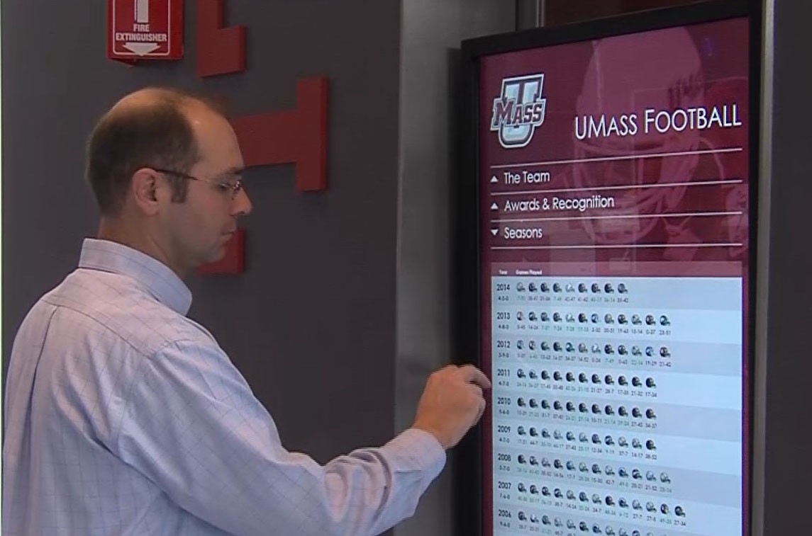 ST. PAUL, MINNESOTA, December 8, 2014 – The University of Massachusetts in Amherst recently opened its Football Performance Center, a 55,000 square foot facility representing the UMass Minutemen football program. Visitors are greeted by a hall of fame showcasing the university's 130-year football program as they enter the facility, located at the north end of Warren P. McGuirk Alumni Stadium. As part of the experience, the university sought an interactive kiosk to compile and present detailed information about the football program. A Carousel digital signage solution from Tightrope Media Systems was selected to address the challenge, featuring custom software-defined programming to bring decades of historical and current data together.