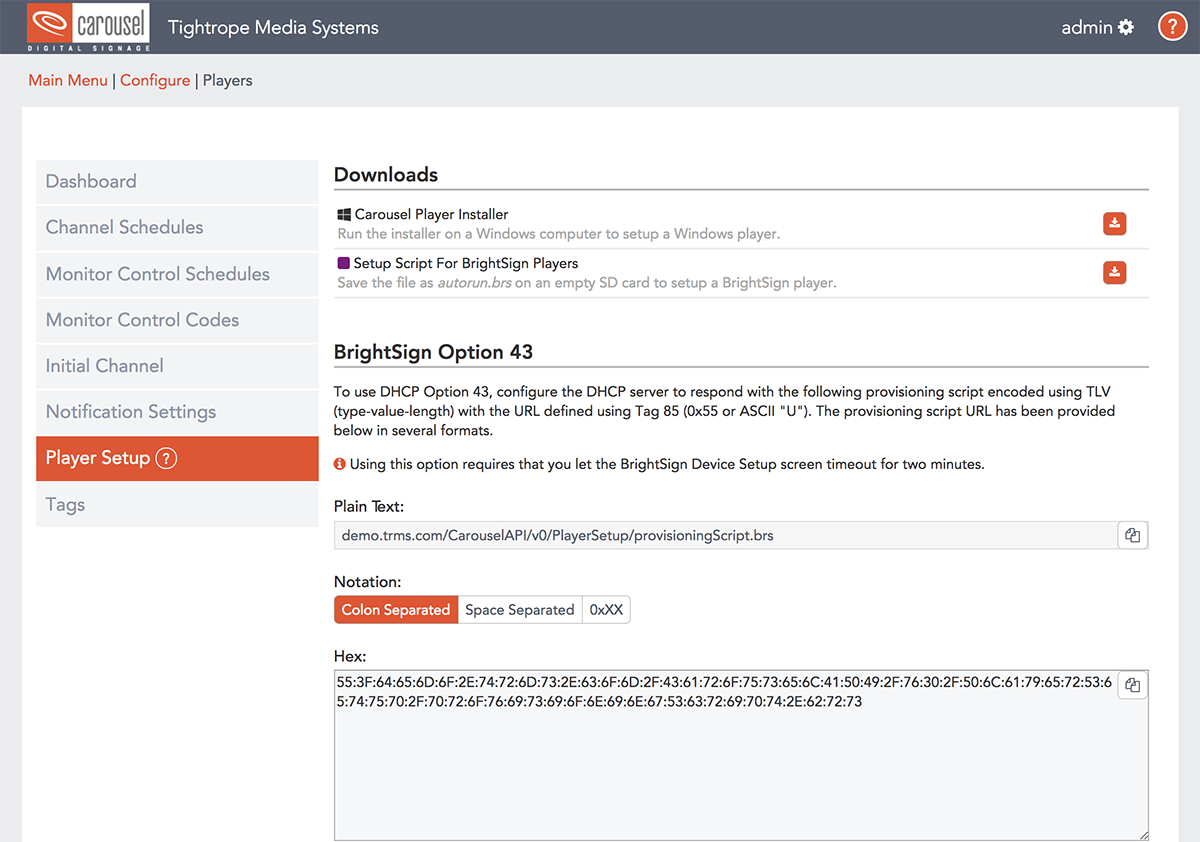 Both BrightSign and Apple TV have zero-touch configuration options. BrightSign by using DHCP Option 43 or using a know URL CNAME in your DNS configuration. With Apple TV it is by using your MDM software to push the configuration profiles. These options are great because there is nothing better than plugging in a brand new media player into the network and watching it boot right into playing your initial channel!